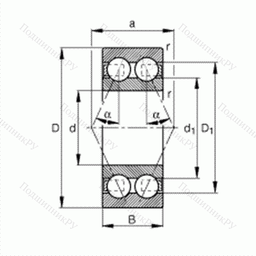 Основные размеры по DIN 628-3, двухрядные, угол контакта α = 25°